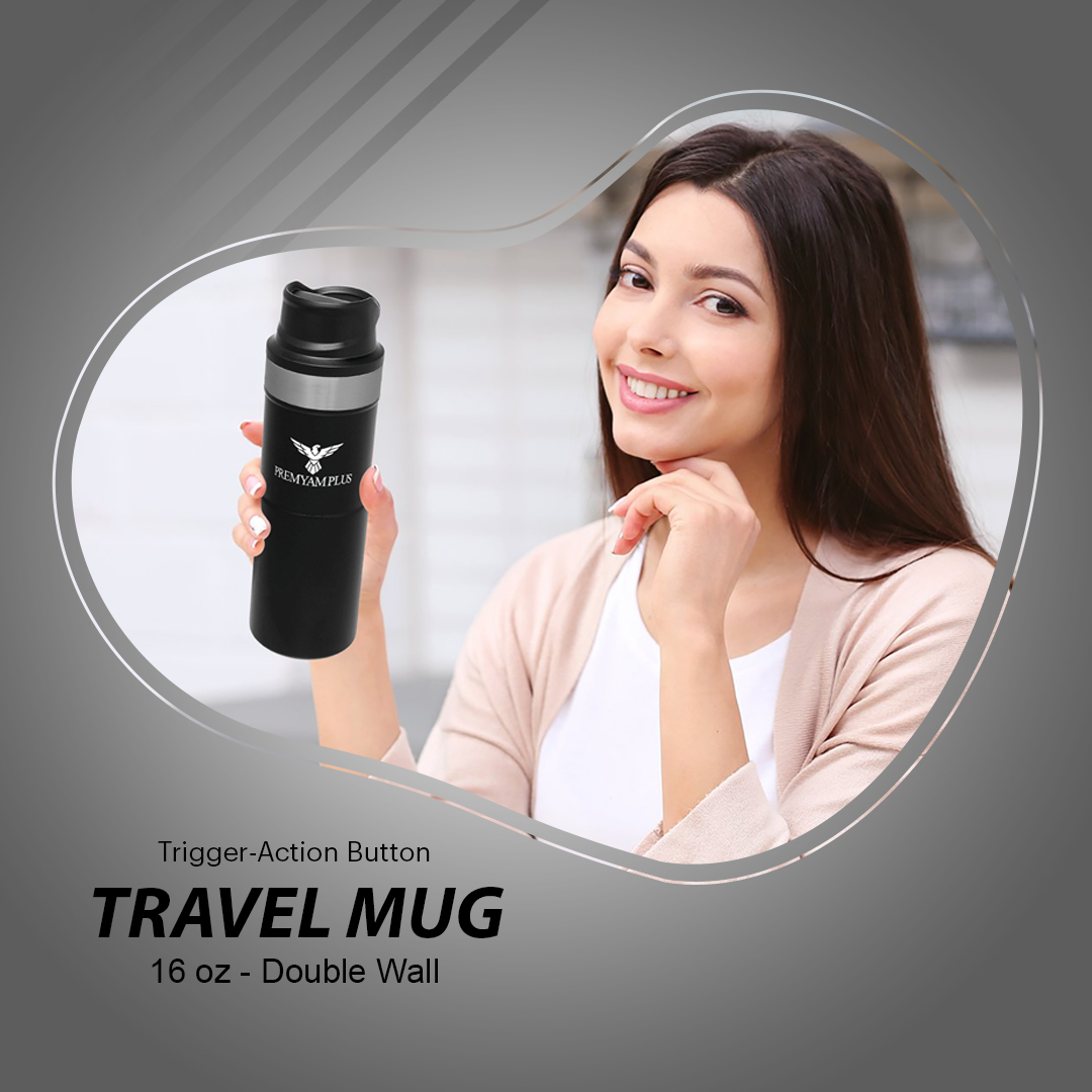 Premyam Plus Classic Trigger Action Travel Mug 16 OZ Double Wall Tea Cup Insulated Sports Outdoor.